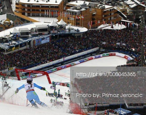 : Fifth placed Tina Maze of Slovenia skiing in second run of women slalom race of FIS Alpine skiing World Championships in Schladming, Austria. Women slalom race of FIS Alpine skiing World championships Schladming 2013, was held in Schladming, Austria, on Saturday, 16th of February 2013.