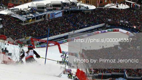 : Winner and new women slalom World Champion Mikaela Shiffrin of USA skiing in second run of women slalom race of FIS Alpine skiing World Championships in Schladming, Austria. Women slalom race of FIS Alpine skiing World championships Schladming 2013, was held in Schladming, Austria, on Saturday, 16th of February 2013.