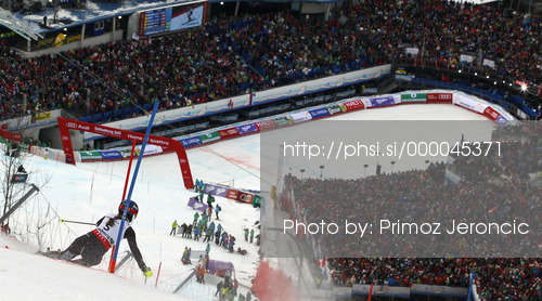 : Winner and new women slalom World Champion Mikaela Shiffrin of USA skiing in second run of women slalom race of FIS Alpine skiing World Championships in Schladming, Austria. Women slalom race of FIS Alpine skiing World championships Schladming 2013, was held in Schladming, Austria, on Saturday, 16th of February 2013.