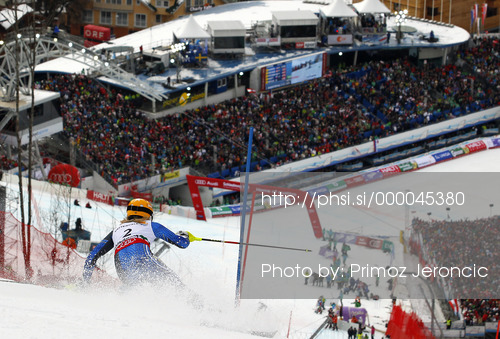 : Third placed Frida Hansdotter of Sweden skiing in second run of women slalom race of FIS Alpine skiing World Championships in Schladming, Austria. Women slalom race of FIS Alpine skiing World championships Schladming 2013, was held in Schladming, Austria, on Saturday, 16th of February 2013.