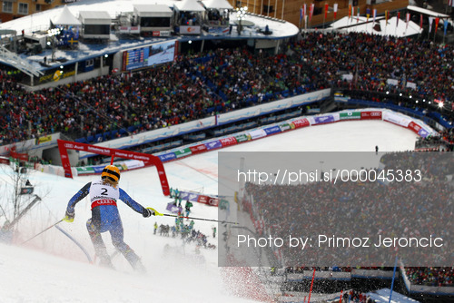 : Third placed Frida Hansdotter of Sweden skiing in second run of women slalom race of FIS Alpine skiing World Championships in Schladming, Austria. Women slalom race of FIS Alpine skiing World championships Schladming 2013, was held in Schladming, Austria, on Saturday, 16th of February 2013.