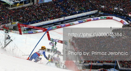 : Third placed Frida Hansdotter of Sweden skiing in second run of women slalom race of FIS Alpine skiing World Championships in Schladming, Austria. Women slalom race of FIS Alpine skiing World championships Schladming 2013, was held in Schladming, Austria, on Saturday, 16th of February 2013.