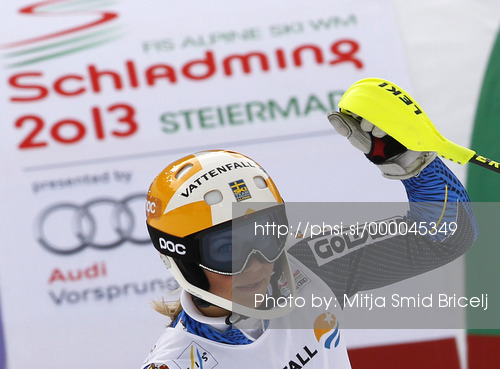 : Third placed Frida Hansdotter of Sweden reacts in finish of second run of women slalom race of FIS Alpine skiing World Championships in Schladming, Austria. Women slalom race of FIS Alpine skiing World championships Schladming 2013, was held in Schladming, Austria, on Saturday, 16th of February 2013.