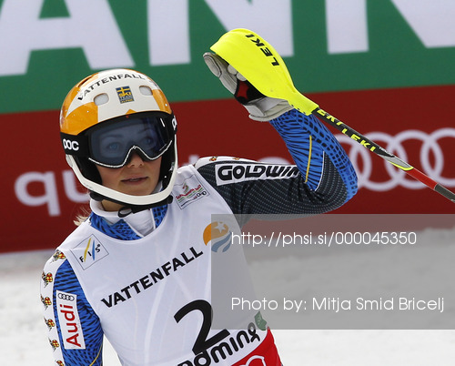 : Third placed Frida Hansdotter of Sweden reacts in finish of second run of women slalom race of FIS Alpine skiing World Championships in Schladming, Austria. Women slalom race of FIS Alpine skiing World championships Schladming 2013, was held in Schladming, Austria, on Saturday, 16th of February 2013.