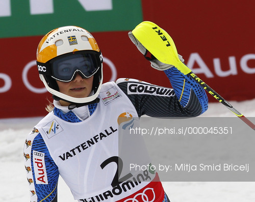 : Third placed Frida Hansdotter of Sweden reacts in finish of second run of women slalom race of FIS Alpine skiing World Championships in Schladming, Austria. Women slalom race of FIS Alpine skiing World championships Schladming 2013, was held in Schladming, Austria, on Saturday, 16th of February 2013.