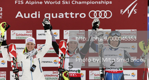 : Winner and new women slalom World Champion Mikaela Shiffrin of USA (M), second placed Michaela Kirchgasser of Austria (L) and third placed Frida Hansdotter of Sweden (R) celebrate their medals won in women slalom race of FIS Alpine skiing World Championships in Schladming, Austria. Women slalom race of FIS Alpine skiing World championships Schladming 2013, was held in Schladming, Austria, on Saturday, 16th of February 2013.