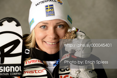 : Third placed Frida Hansdotter of Sweden poses with her medal won in women slalom race of FIS Alpine skiing World Championships in Schladming, Austria. Women slalom race of FIS Alpine skiing World championships Schladming 2013, was held in Schladming, Austria, on Saturday, 16th of February 2013.