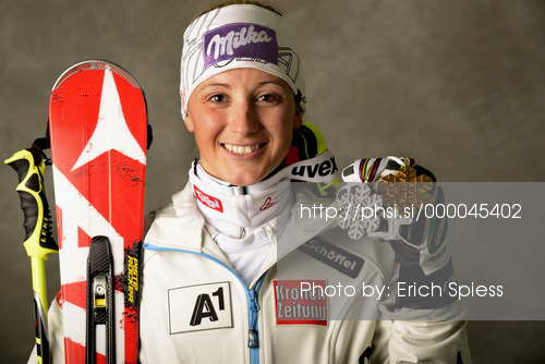 : Second placed Michaela Kirchgasser of Austria poses with her medal won in women slalom race of FIS Alpine skiing World Championships in Schladming, Austria. Women slalom race of FIS Alpine skiing World championships Schladming 2013, was held in Schladming, Austria, on Saturday, 16th of February 2013.