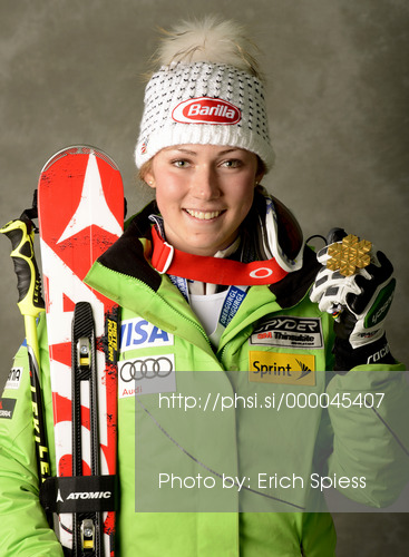: Winner and new slalom World Champion Mikaela Shiffrin of USA poses with her medal won in women slalom race of FIS Alpine skiing World Championships in Schladming, Austria. Women slalom race of FIS Alpine skiing World championships Schladming 2013, was held in Schladming, Austria, on Saturday, 16th of February 2013.