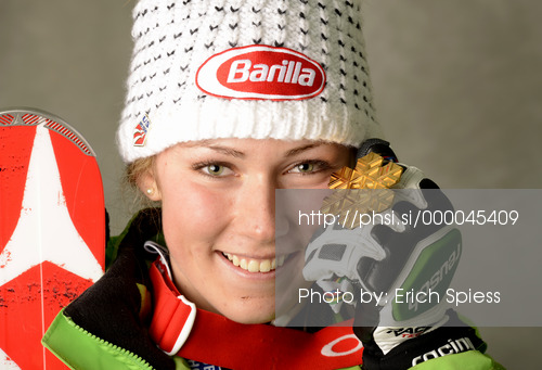 : Winner and new slalom World Champion Mikaela Shiffrin of USA poses with her medal won in women slalom race of FIS Alpine skiing World Championships in Schladming, Austria. Women slalom race of FIS Alpine skiing World championships Schladming 2013, was held in Schladming, Austria, on Saturday, 16th of February 2013.