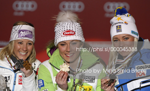 : Winner and new slalom World Champion Mikaela Shiffrin of USA (M), second placed Michaela Kirchgasser of Austria (L) and third placed Frida Hansdotter of Sweden (R) celebrate their medals won in women slalom race of FIS Alpine skiing World Championships in Schladming, Austria. Women slalom race of FIS Alpine skiing World championships Schladming 2013, was held in Schladming, Austria, on Saturday, 16th of February 2013.