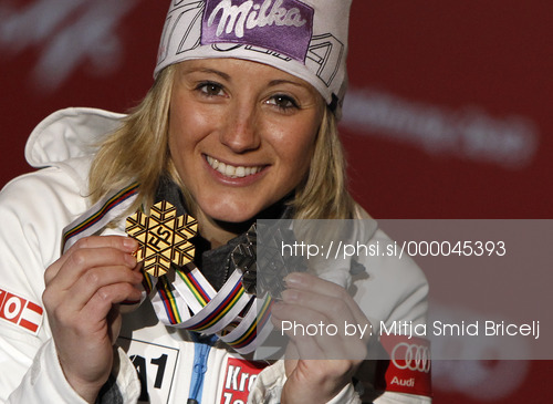 : Second placed Michaela Kirchgasser of Austria celebrates her medal won in women slalom race of FIS Alpine skiing World Championships in Schladming, Austria. Women slalom race of FIS Alpine skiing World championships Schladming 2013, was held in Schladming, Austria, on Saturday, 16th of February 2013.