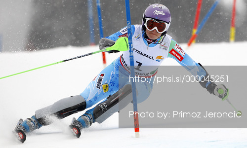: Tina Maze of Slovenia skiing in first run of women slalom race of FIS Alpine skiing World Championships in Schladming, Austria. Women slalom race of FIS Alpine skiing World championships Schladming 2013, was held in Schladming, Austria, on Saturday, 16th of February 2013.
