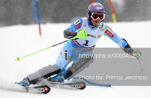 : Tina Maze of Slovenia skiing in first run of women slalom race of FIS Alpine skiing World Championships in Schladming, Austria. Women slalom race of FIS Alpine skiing World championships Schladming 2013, was held in Schladming, Austria, on Saturday, 16th of February 2013.