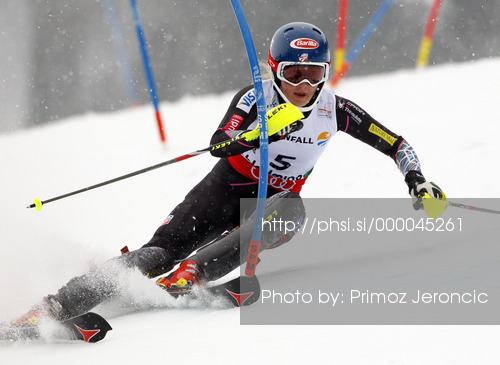 : Mikaela Shiffrin of USA skiing in first run of women slalom race of FIS Alpine skiing World Championships in Schladming, Austria. Women slalom race of FIS Alpine skiing World championships Schladming 2013, was held in Schladming, Austria, on Saturday, 16th of February 2013.