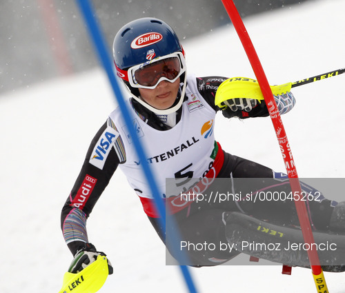 : Mikaela Shiffrin of USA skiing in first run of women slalom race of FIS Alpine skiing World Championships in Schladming, Austria. Women slalom race of FIS Alpine skiing World championships Schladming 2013, was held in Schladming, Austria, on Saturday, 16th of February 2013.