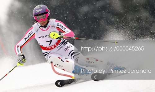 : Maria Hoefl-Riesch of Germany skiing in first run of women slalom race of FIS Alpine skiing World Championships in Schladming, Austria. Women slalom race of FIS Alpine skiing World championships Schladming 2013, was held in Schladming, Austria, on Saturday, 16th of February 2013.