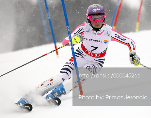 : Maria Hoefl-Riesch of Germany skiing in first run of women slalom race of FIS Alpine skiing World Championships in Schladming, Austria. Women slalom race of FIS Alpine skiing World championships Schladming 2013, was held in Schladming, Austria, on Saturday, 16th of February 2013.