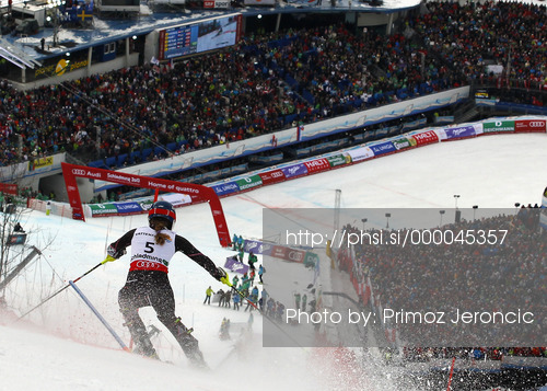 : Winner and new women slalom World Champion Mikaela Shiffrin of USA skiing in second run of women slalom race of FIS Alpine skiing World Championships in Schladming, Austria. Women slalom race of FIS Alpine skiing World championships Schladming 2013, was held in Schladming, Austria, on Saturday, 16th of February 2013.