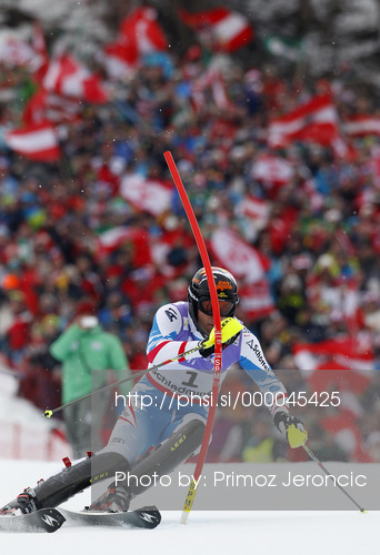 : Mario Matt of Austria skiing in first run of men slalom race of FIS Alpine skiing World Championships in Schladming, Austria. Men slalom race of FIS Alpine skiing World championships Schladming 2013, was held in Schladming, Austria, on Sunday, 17th of February 2013.