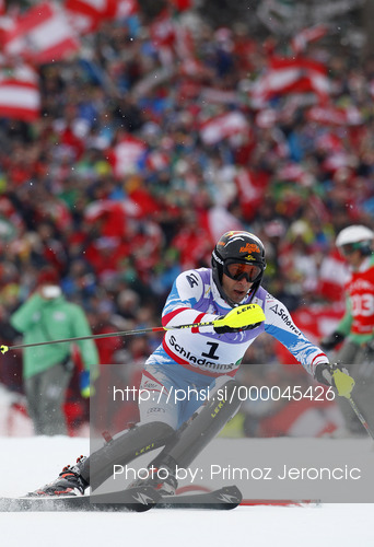 : Mario Matt of Austria skiing in first run of men slalom race of FIS Alpine skiing World Championships in Schladming, Austria. Men slalom race of FIS Alpine skiing World championships Schladming 2013, was held in Schladming, Austria, on Sunday, 17th of February 2013.