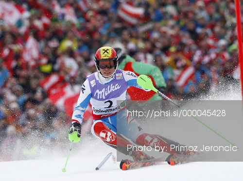 : Marcel Hirscher of Austria skiing in first run of men slalom race of FIS Alpine skiing World Championships in Schladming, Austria. Men slalom race of FIS Alpine skiing World championships Schladming 2013, was held in Schladming, Austria, on Sunday, 17th of February 2013.