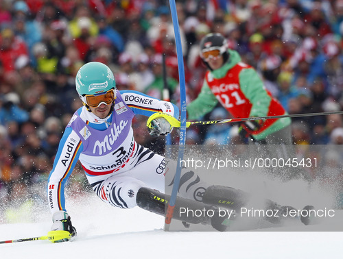 : Felix Neureuther of Germany skiing in first run of men slalom race of FIS Alpine skiing World Championships in Schladming, Austria. Men slalom race of FIS Alpine skiing World championships Schladming 2013, was held in Schladming, Austria, on Sunday, 17th of February 2013.