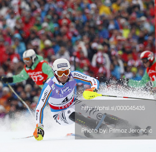 : Fritz Dopfer of Germany skiing in first run of men slalom race of FIS Alpine skiing World Championships in Schladming, Austria. Men slalom race of FIS Alpine skiing World championships Schladming 2013, was held in Schladming, Austria, on Sunday, 17th of February 2013.