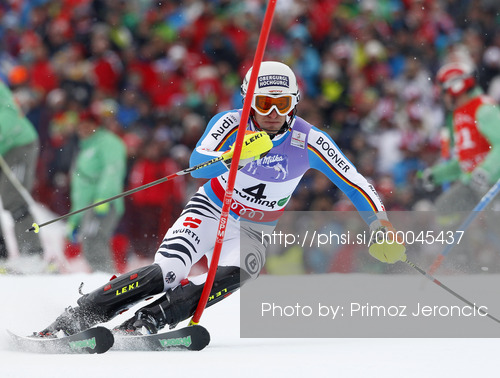 : Fritz Dopfer of Germany skiing in first run of men slalom race of FIS Alpine skiing World Championships in Schladming, Austria. Men slalom race of FIS Alpine skiing World championships Schladming 2013, was held in Schladming, Austria, on Sunday, 17th of February 2013.