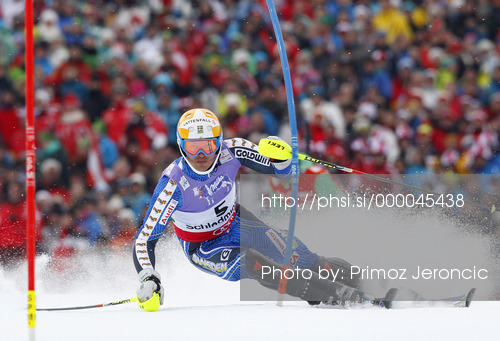 : Andre Myhrer of Sweden skiing in first run of men slalom race of FIS Alpine skiing World Championships in Schladming, Austria. Men slalom race of FIS Alpine skiing World championships Schladming 2013, was held in Schladming, Austria, on Sunday, 17th of February 2013.