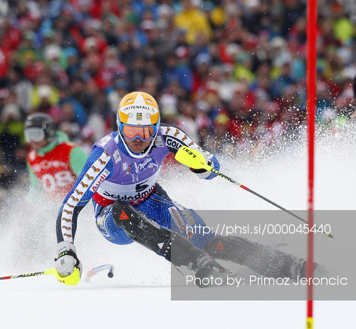 : Andre Myhrer of Sweden skiing in first run of men slalom race of FIS Alpine skiing World Championships in Schladming, Austria. Men slalom race of FIS Alpine skiing World championships Schladming 2013, was held in Schladming, Austria, on Sunday, 17th of February 2013.