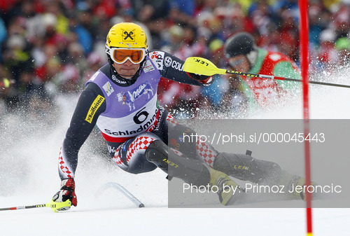 : Ivica Kostelic of Croatia skiing in first run of men slalom race of FIS Alpine skiing World Championships in Schladming, Austria. Men slalom race of FIS Alpine skiing World championships Schladming 2013, was held in Schladming, Austria, on Sunday, 17th of February 2013.