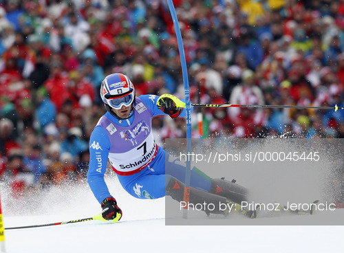 : Manfred Moelgg of Italy skiing in first run of men slalom race of FIS Alpine skiing World Championships in Schladming, Austria. Men slalom race of FIS Alpine skiing World championships Schladming 2013, was held in Schladming, Austria, on Sunday, 17th of February 2013.
