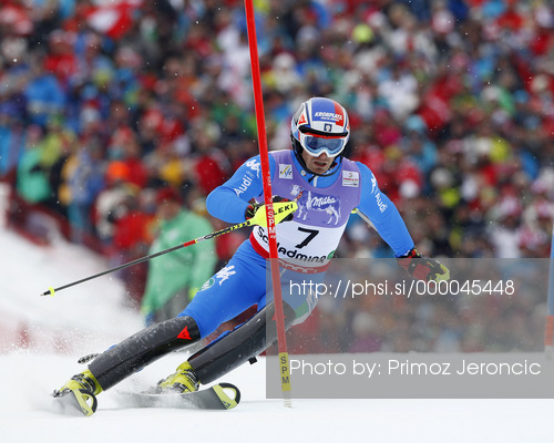 : Manfred Moelgg of Italy skiing in first run of men slalom race of FIS Alpine skiing World Championships in Schladming, Austria. Men slalom race of FIS Alpine skiing World championships Schladming 2013, was held in Schladming, Austria, on Sunday, 17th of February 2013.