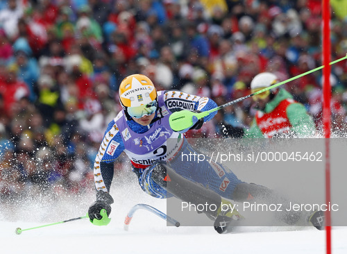 : Jens Byggmark of Sweden skiing in first run of men slalom race of FIS Alpine skiing World Championships in Schladming, Austria. Men slalom race of FIS Alpine skiing World championships Schladming 2013, was held in Schladming, Austria, on Sunday, 17th of February 2013.