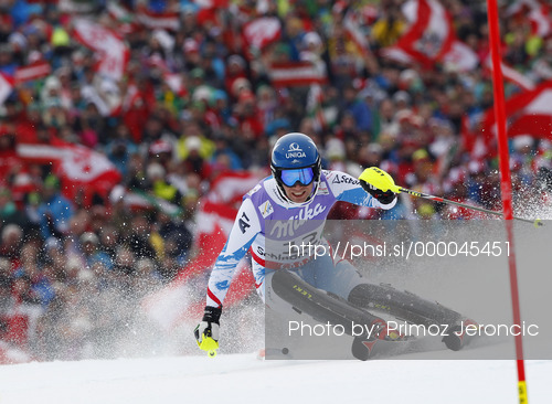 : Benjamin Raich of Austria skiing in first run of men slalom race of FIS Alpine skiing World Championships in Schladming, Austria. Men slalom race of FIS Alpine skiing World championships Schladming 2013, was held in Schladming, Austria, on Sunday, 17th of February 2013.