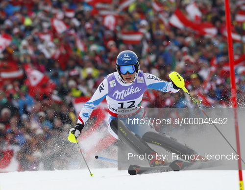 : Benjamin Raich of Austria skiing in first run of men slalom race of FIS Alpine skiing World Championships in Schladming, Austria. Men slalom race of FIS Alpine skiing World championships Schladming 2013, was held in Schladming, Austria, on Sunday, 17th of February 2013.