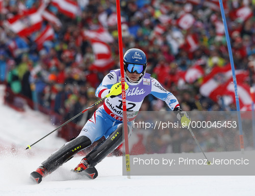 : Benjamin Raich of Austria skiing in first run of men slalom race of FIS Alpine skiing World Championships in Schladming, Austria. Men slalom race of FIS Alpine skiing World championships Schladming 2013, was held in Schladming, Austria, on Sunday, 17th of February 2013.