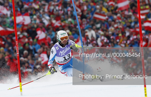 : Manfred Pranger of Austria skiing in first run of men slalom race of FIS Alpine skiing World Championships in Schladming, Austria. Men slalom race of FIS Alpine skiing World championships Schladming 2013, was held in Schladming, Austria, on Sunday, 17th of February 2013.