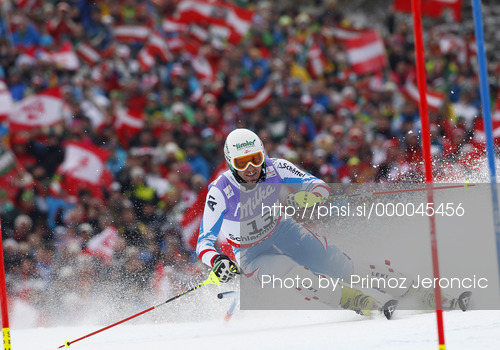 : Manfred Pranger of Austria skiing in first run of men slalom race of FIS Alpine skiing World Championships in Schladming, Austria. Men slalom race of FIS Alpine skiing World championships Schladming 2013, was held in Schladming, Austria, on Sunday, 17th of February 2013.