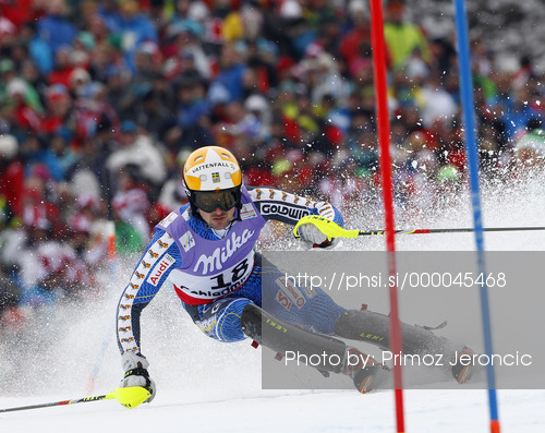 : Markus Larsson of Sweden skiing in first run of men slalom race of FIS Alpine skiing World Championships in Schladming, Austria. Men slalom race of FIS Alpine skiing World championships Schladming 2013, was held in Schladming, Austria, on Sunday, 17th of February 2013.