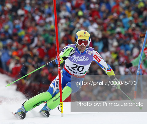 : Mitja Valencic of Slovenia skiing in first run of men slalom race of FIS Alpine skiing World Championships in Schladming, Austria. Men slalom race of FIS Alpine skiing World championships Schladming 2013, was held in Schladming, Austria, on Sunday, 17th of February 2013.