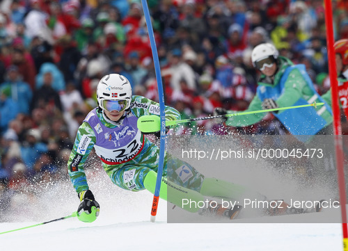 : Henrik Kristoffersen of Norway skiing in first run of men slalom race of FIS Alpine skiing World Championships in Schladming, Austria. Men slalom race of FIS Alpine skiing World championships Schladming 2013, was held in Schladming, Austria, on Sunday, 17th of February 2013.
