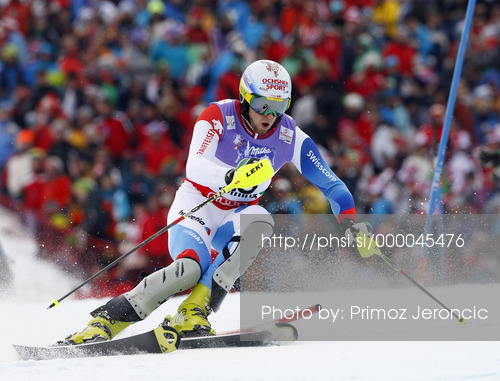 : Marc Gini of Switzerland skiing in first run of men slalom race of FIS Alpine skiing World Championships in Schladming, Austria. Men slalom race of FIS Alpine skiing World championships Schladming 2013, was held in Schladming, Austria, on Sunday, 17th of February 2013.