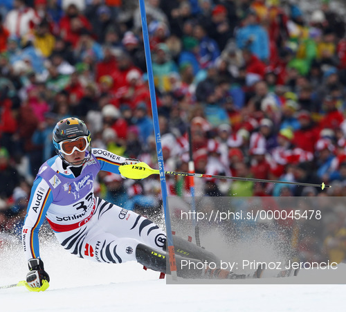 : Stefan Luitz of Germany skiing in first run of men slalom race of FIS Alpine skiing World Championships in Schladming, Austria. Men slalom race of FIS Alpine skiing World championships Schladming 2013, was held in Schladming, Austria, on Sunday, 17th of February 2013.