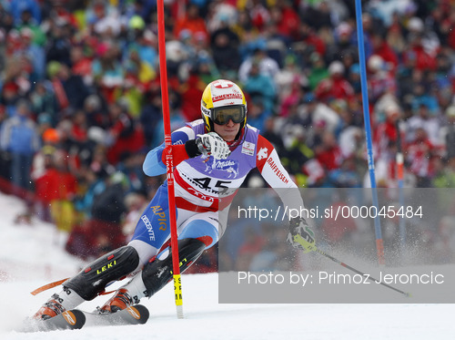 : Reto Schmidiger of Switzerland skiing in first run of men slalom race of FIS Alpine skiing World Championships in Schladming, Austria. Men slalom race of FIS Alpine skiing World championships Schladming 2013, was held in Schladming, Austria, on Sunday, 17th of February 2013.