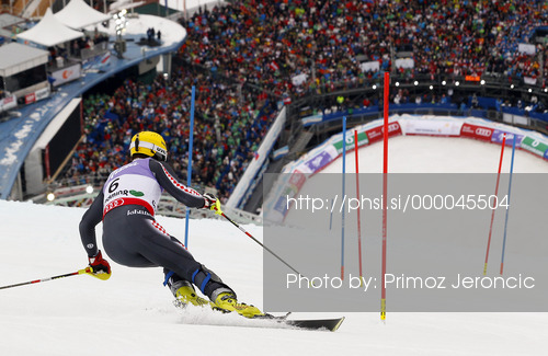 : Fifth placed Ivica Kostelic of Croatia skiing in second run of men slalom race of FIS Alpine skiing World Championships in Schladming, Austria. Men slalom race of FIS Alpine skiing World championships Schladming 2013, was held in Schladming, Austria, on Sunday, 17th of February 2013.