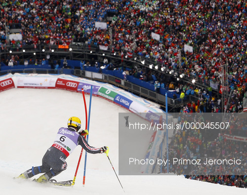 : Fifth placed Ivica Kostelic of Croatia skiing in second run of men slalom race of FIS Alpine skiing World Championships in Schladming, Austria. Men slalom race of FIS Alpine skiing World championships Schladming 2013, was held in Schladming, Austria, on Sunday, 17th of February 2013.