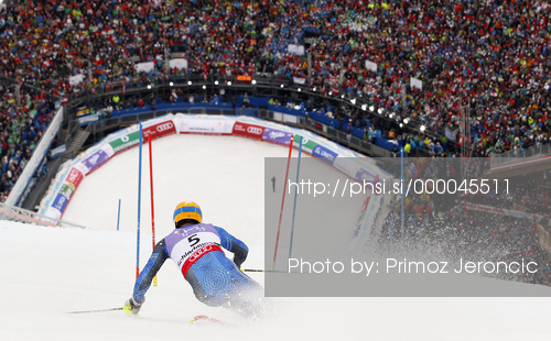 : Fourth placed Andre Myhrer of Sweden skiing in second run of men slalom race of FIS Alpine skiing World Championships in Schladming, Austria. Men slalom race of FIS Alpine skiing World championships Schladming 2013, was held in Schladming, Austria, on Sunday, 17th of February 2013.