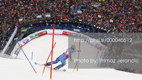 : Fourth placed Andre Myhrer of Sweden skiing in second run of men slalom race of FIS Alpine skiing World Championships in Schladming, Austria. Men slalom race of FIS Alpine skiing World championships Schladming 2013, was held in Schladming, Austria, on Sunday, 17th of February 2013.